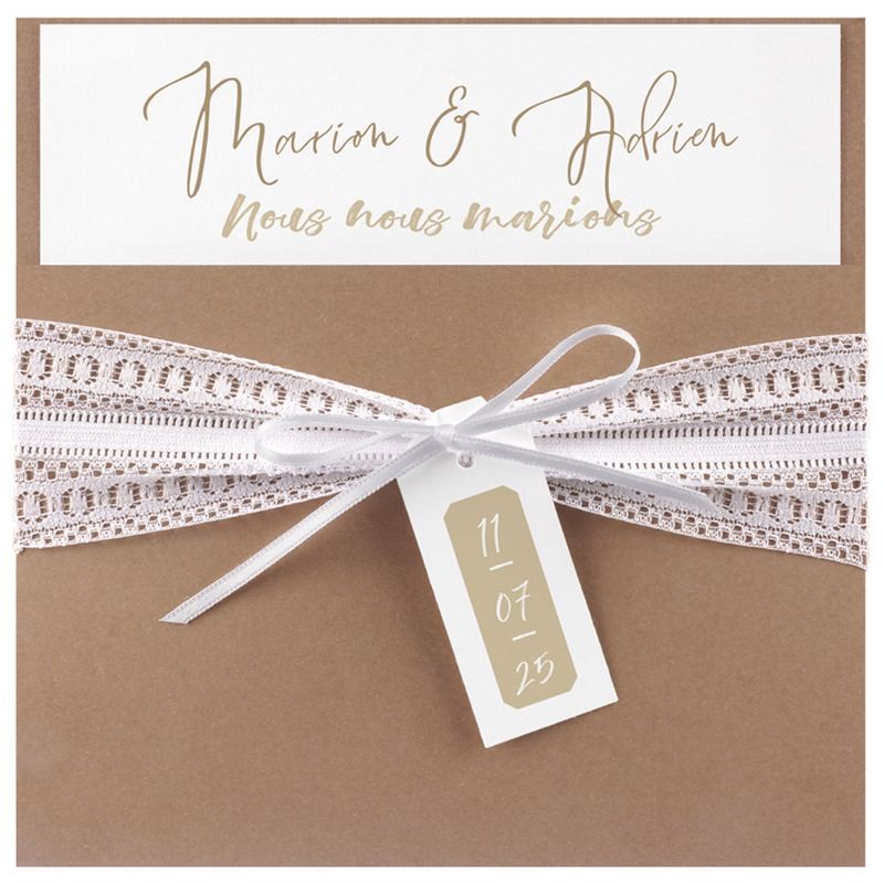 Faire Part Mariage Boheme Chic Dentelle Blanche Sur Pochette Camel